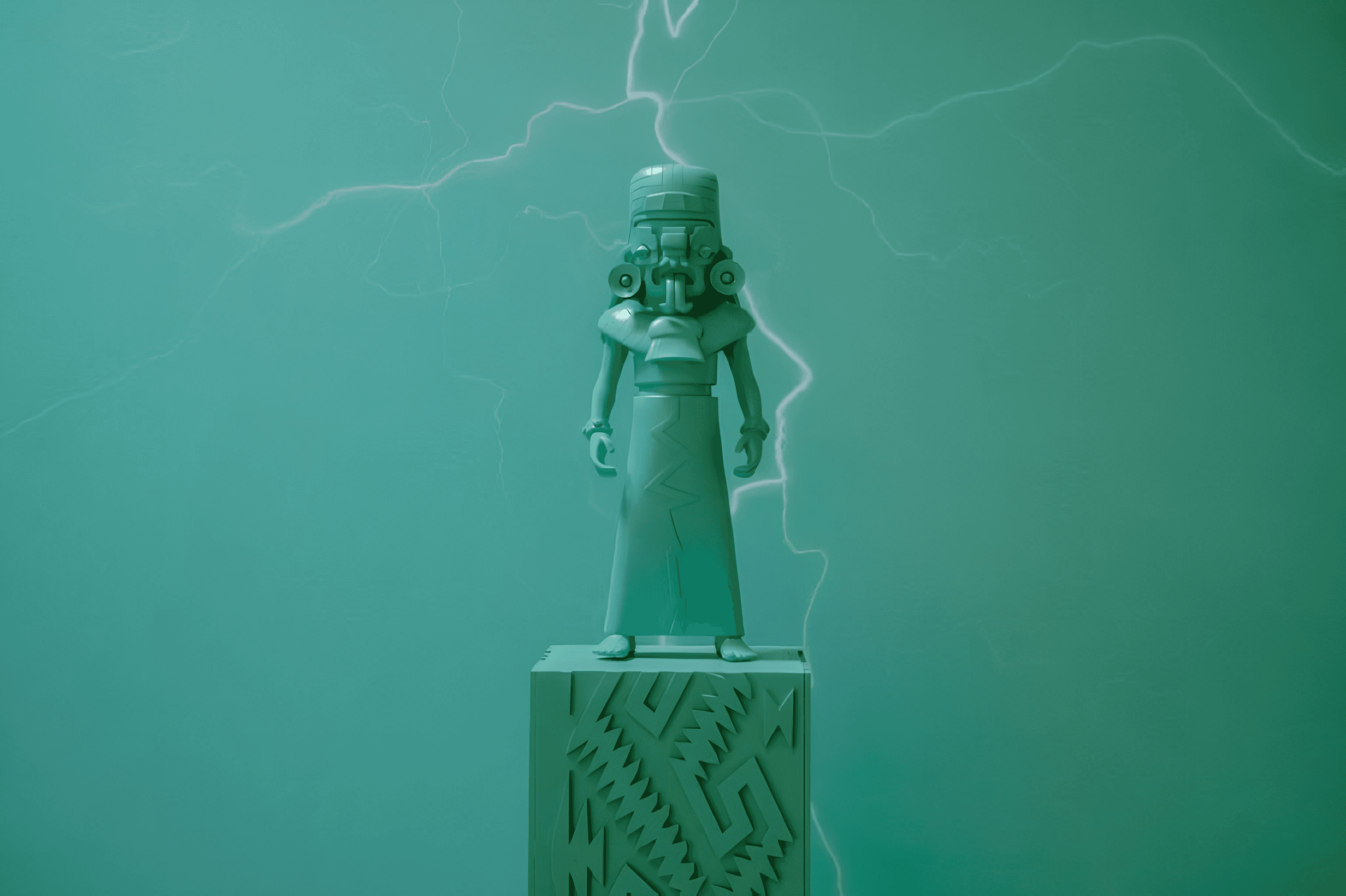 Haciendo referencia a la cultura pop de los Art-Toys, Sabino Guisu ilustra cómo sería la figura simbólica de Cocijo en el universo parelelo de la modernidad. ¿Qué habrían pensado los antiguos mexicanos de la electricidad, de los motores, del plástico? Quizá que todo esto es obra de un demonio. O de un dios desquiciado. ¿Es prudente preguntar si en la mente humana todo eso no está mezclado como en un rompecabezas? El trabajo del creador oaxaqueño ha sido el de buscar aquellas piezas enterradas en la conciencia, fragmentos que laten con un fuego primordial. Y darles un nuevo significado. Sabino Guisu visitó hace un par de años el Kimbelt Art Museum, en Texas. Allí, entre el acervo de diversas culturas autóctonas, habita una urna funeraria del dios Cocijo, deidad de la lluvia y del rayo entre los antiguos zapotecas. El artista pensó en cómo hacer volver dicha figura a su lugar, a Oaxaca. Imposible sustraerlo o pedir al museo su devolución. Así que mejor dicidió reescribir la historia de Cocijo y lo hizo volver de forma smbólica a nuestros aciagos días. Pero esta deidad renació como una especie de “action figure”. Los materiales utilizados, conglomerado, metal, resinas, acrílicos, son todos elementos profanos, materiales de la era industrial. Los colores, ya de por sí eléctricos, dan un extraño barniz de modernidad, que parece chocar con la deidad atemporal. ¿Hacía donde van las imágenes sagradas? ¿Dónde desembocan todas los símbolos, los rituales, las grietas de las que mana lo sagrado? ¿Es posible hablar aún de la mitología? Es posible. Y así queda de manifiesto frente a esta serie de variaciones del dios Cocijo.